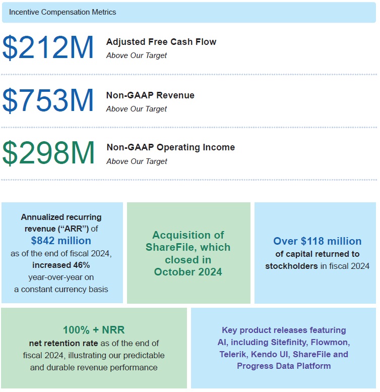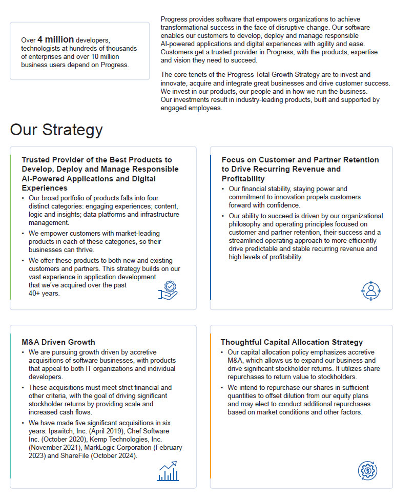 As we have for decades, in 2024, Progress remained focused on empowering our customers, our people, and our products. Throughout the year, the Board and executive leadership collaborated closely to ensure that Progress effectively executed its Total Growth Strategy, and the financial, strategic and business results delivered in fiscal 2024 demonstrated the success of our approach.