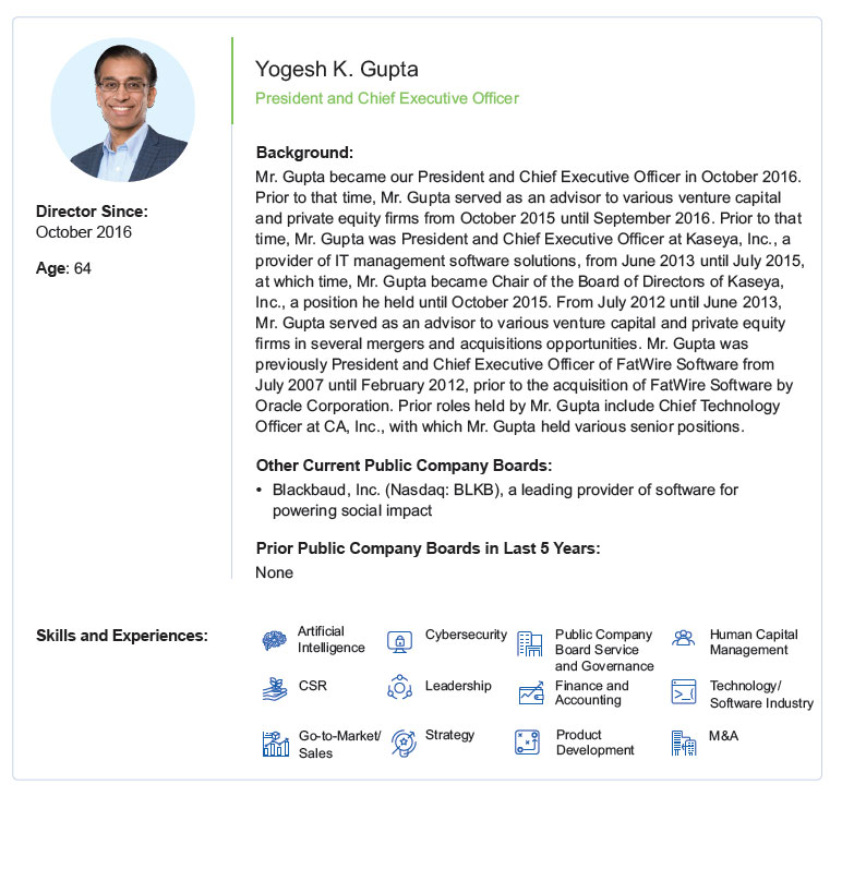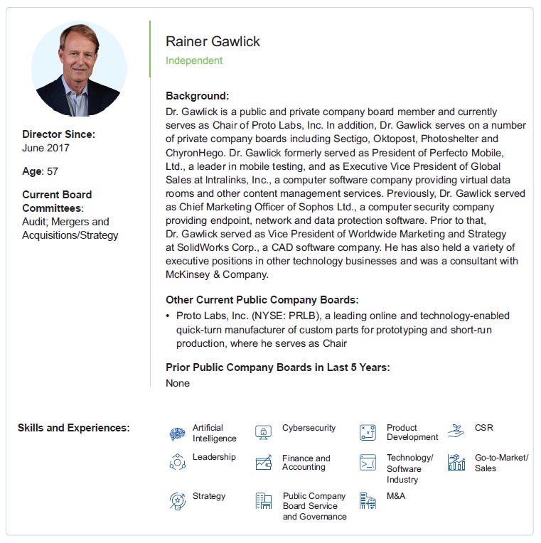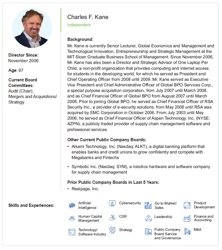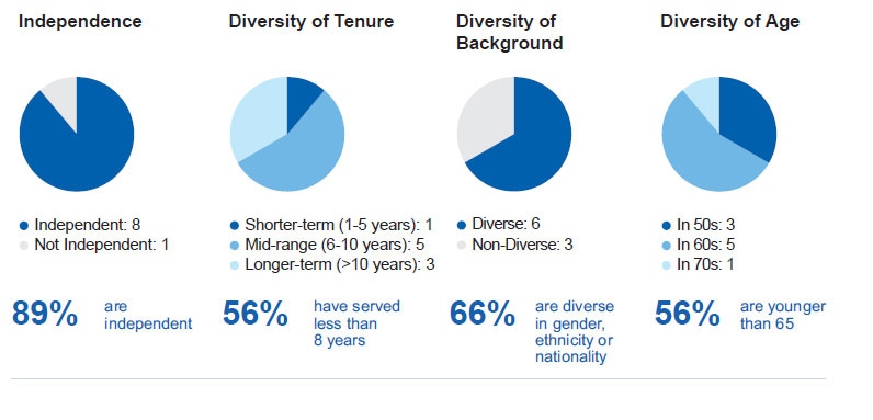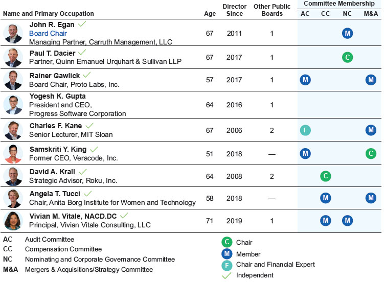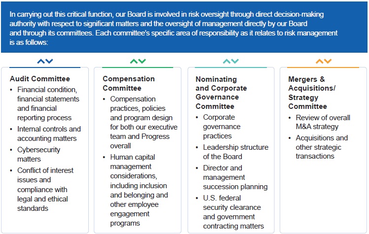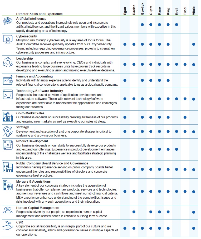 Current Board nominees represent a wide range of backgrounds and expertise. We believe our varied experiences, perspectives and skills contribute to the Board’s effectiveness in managing risk and providing guidance that positions Progress for long-term success in a changing business environment. Of our nine Board nominees, eight are independent, which includes our Board Chair and all committee members. This Proxy Statement describes Progress’ corporate governance policies and practices that foster the Board’s effective oversight of the Company’s business strategies and practices.