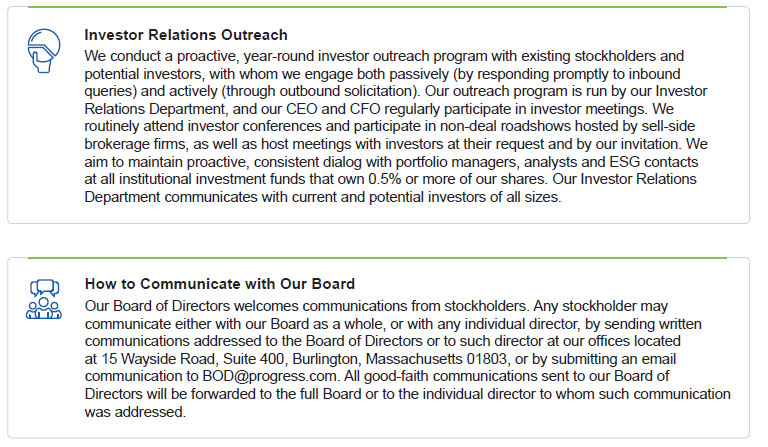 We intend to answer all questions submitted during the Annual Meeting that are pertinent to the Company and the items being voted on by stockholders, as time permits and in accordance with our rules of conduct and procedures. If we are unable to respond to a stockholder’s properly submitted question due to time constraints, we will either post the response on the investor relations section of our website following the Annual Meeting or respond directly to that stockholder using the contact information provided. Questions and answers will be grouped by topic, and substantially similar questions will be answered only once. To promote fairness, efficiently use the Company’s resources and address all stockholder questions, we will respond to no more than two questions from any single stockholder. All questions received from stockholders during the virtual Annual Meeting will be posted on the Company’s investor relations website at http://investors.progress.com/ as soon as practicable following the Annual Meeting.