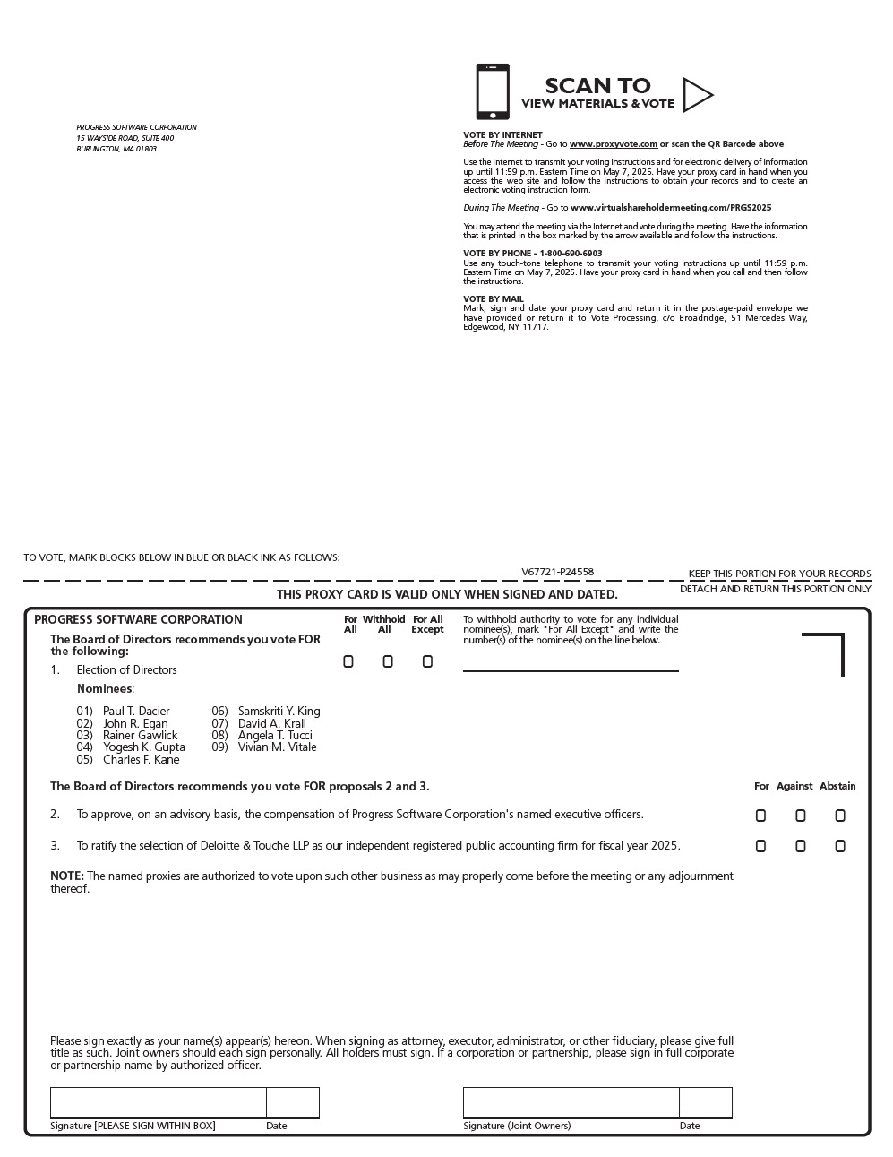 Signature [PLEASE SIGN WITHIN BOX] Date Signature (Joint Owners) Date TO VOTE, MARK BLOCKS BELOW IN BLUE OR BLACK INK AS FOLLOWS: KEEP THIS PORTION FOR YOUR RECORDS THIS PROXY CARD IS VALID ONLY WHEN SIGNED AND DATED. DETACH AND RETURN THIS PORTION ONLY V67721-P24558 Nominees: 2. To approve, on an advisory basis, the compensation of Progress Software Corporation's named executive officers. 3. To ratify the selection of Deloitte & Touche LLP as our independent registered public accounting firm for fiscal year 2025. NOTE: The named proxies are authorized to vote upon such other business as may properly come before the meeting or any adjournment thereof. ! ! ! 1. Election of Directors 01) Paul T. Dacier 02) John R. Egan 03) Rainer Gawlick 04) Yogesh K. Gupta 05) Charles F. Kane 06) Samskriti Y. King 07) David A. Krall 08) Angela T. Tucci 09) Vivian M. Vitale For All Withhold All For All Except For Against Abstain ! ! ! ! ! ! Please sign exactly as your name(s) appear(s) hereon. When signing as attorney, executor, administrator, or other fiduciary, please give full title as such. Joint owners should each sign personally. All holders must sign. If a corporation or partnership, please sign in full corporate or partnership name by authorized officer. PROGRESS SOFTWARE CORPORATION To withhold authority to vote for any individual nominee(s), mark "For All Except" and write the The Board of Directors recommends you vote FOR number(s) of the nominee(s) on the line below. the following: The Board of Directors recommends you vote FOR proposals 2 and 3. PROGRESS SOFTWARE CORPORATION 15 WAYSIDE ROAD, SUITE 400 BURLINGTON, MA 01803 VOTE BY INTERNET Before The Meeting - Go to www.proxyvote.com or scan the QR Barcode above Use the Internet to transmit your voting instructions and for electronic delivery of information up until 11:59 p.m. Eastern Time on May 7, 2025. Have your proxy card in hand when you access the web site and follow the instructions to obtain your records and to create an electronic voting instruction form. During The Meeting - Go to www.virtualshareholdermeeting.com/PRGS2025 You may attend the meeting via the Internet and vote during the meeting. Have the information that is printed in the box marked by the arrow available and follow the instructions. VOTE BY PHONE - 1-800-690-6903 Use any touch-tone telephone to transmit your voting instructions up until 11:59 p.m. Eastern Time on May 7, 2025. Have your proxy card in hand when you call and then follow the instructions. VOTE BY MAIL Mark, sign and date your proxy card and return it in the postage-paid envelope we have provided or return it to Vote Processing, c/o Broadridge, 51 Mercedes Way, Edgewood, NY 11717. SCAN TO VIEW MATERIALS & VOTE w