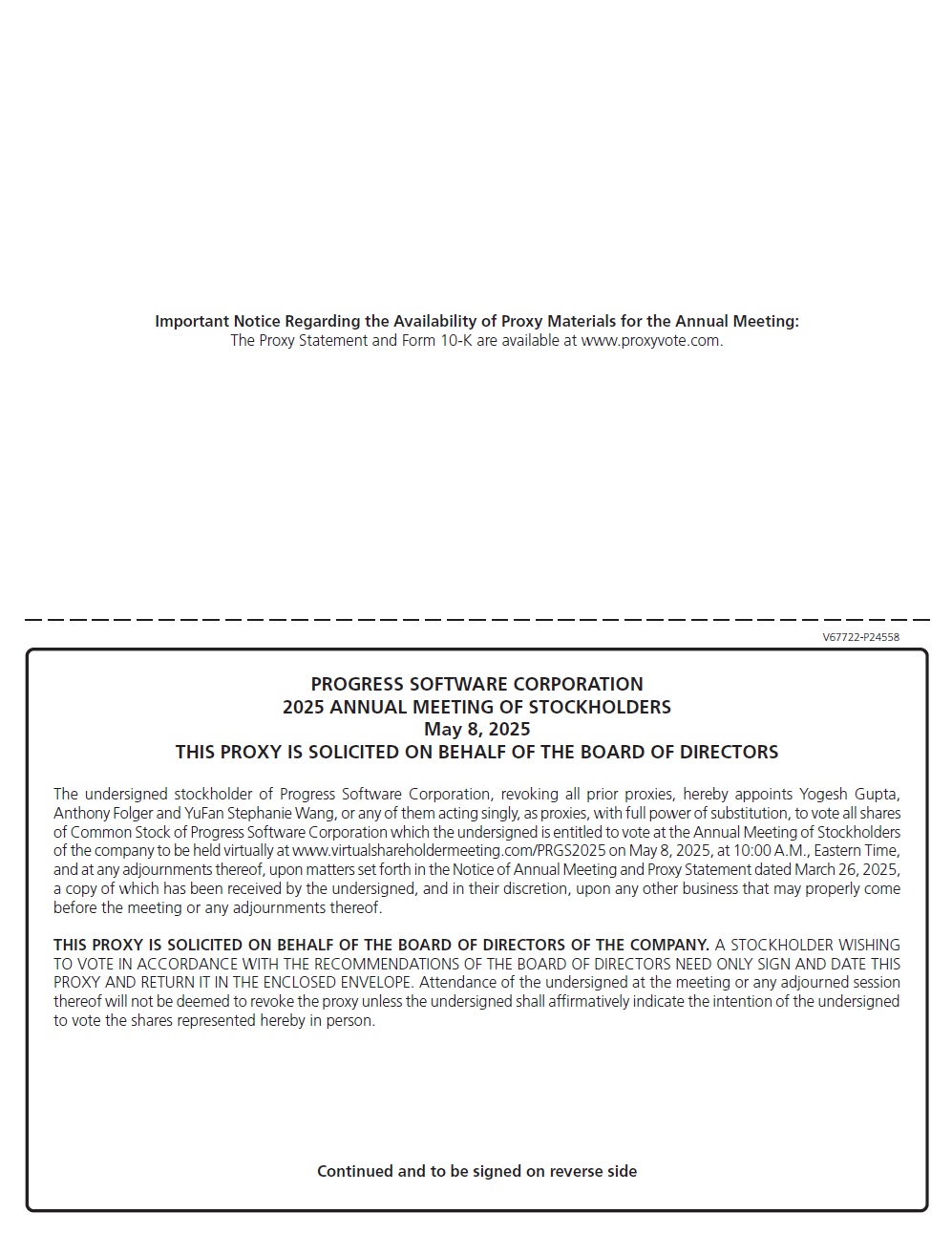 Important Notice Regarding the Availability of Proxy Materials for the Annual Meeting: The Proxy Statement and Form 10-K are available at www.proxyvote.com. V67722-P24558 PROGRESS SOFTWARE CORPORATION 2025 ANNUAL MEETING OF STOCKHOLDERS May 8, 2025 THIS PROXY IS SOLICITED ON BEHALF OF THE BOARD OF DIRECTORS The undersigned stockholder of Progress Software Corporation, revoking all prior proxies, hereby appoints Yogesh Gupta, Anthony Folger and YuFan Stephanie Wang, or any of them acting singly, as proxies, with full power of substitution, to vote all shares of Common Stock of Progress Software Corporation which the undersigned is entitled to vote at the Annual Meeting of Stockholders of the company to be held virtually at www.virtualshareholdermeeting.com/PRGS2025 on May 8, 2025, at 10:00 A.M., Eastern Time, and at any adjournments thereof, upon matters set forth in the Notice of Annual Meeting and Proxy Statement dated March 26, 2025, a copy of which has been received by the undersigned, and in their discretion, upon any other business that may properly come before the meeting or any adjournments thereof. THIS PROXY IS SOLICITED ON BEHALF OF THE BOARD OF DIRECTORS OF THE COMPANY. A STOCKHOLDER WISHING TO VOTE IN ACCORDANCE WITH THE RECOMMENDATIONS OF THE BOARD OF DIRECTORS NEED ONLY SIGN AND DATE THIS PROXY AND RETURN IT IN THE ENCLOSED ENVELOPE. Attendance of the undersigned at the meeting or any adjourned session thereof will not be deemed to revoke the proxy unless the undersigned shall affirmatively indicate the intention of the undersigned to vote the shares represented hereby in person. Continued and to be signed on reverse side