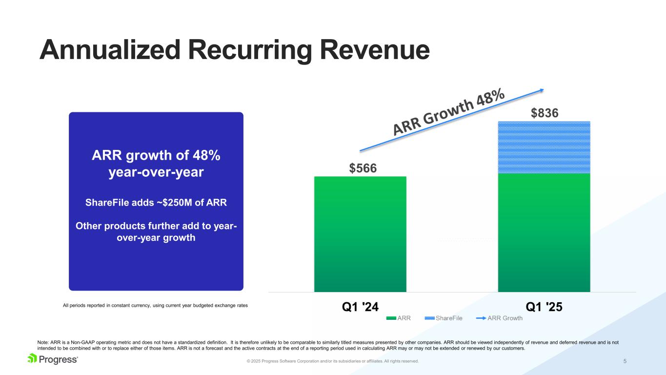 4© 2025 Progress Software Corporation and/or its subsidiaries or affiliates. All rights reserved. Summary Highlights Q1 2025 • Revenues of $238M increased 30% year-over-year in constant currency; at high end of prior guidance of $232M - $238M • ARR: $836M, up 48% year-over-year in constant currency, 3% pro-forma • NRR 100+% • Operating margins strong at 39% • EPS: $1.31, well above high end of prior guidance of $1.02 - $1.08 • Q2 ’25 guidance: Revenue $235M - $241M; EPS $1.28 - $1.34 • FY ’25 guidance: Revenue of $958M - $970M; EPS of $5.25 - $5.37 All figures presented are non-GAAP. Definitions of non-GAAP financial measures (including ARR and NRR) can be found in "Important Information Regarding Non-GAAP Financial Information". Strong Q1 Results; ARR Growth of 48%, Net Retention Rate Exceeds 100%; ShareFile Integration Ahead of Plan
