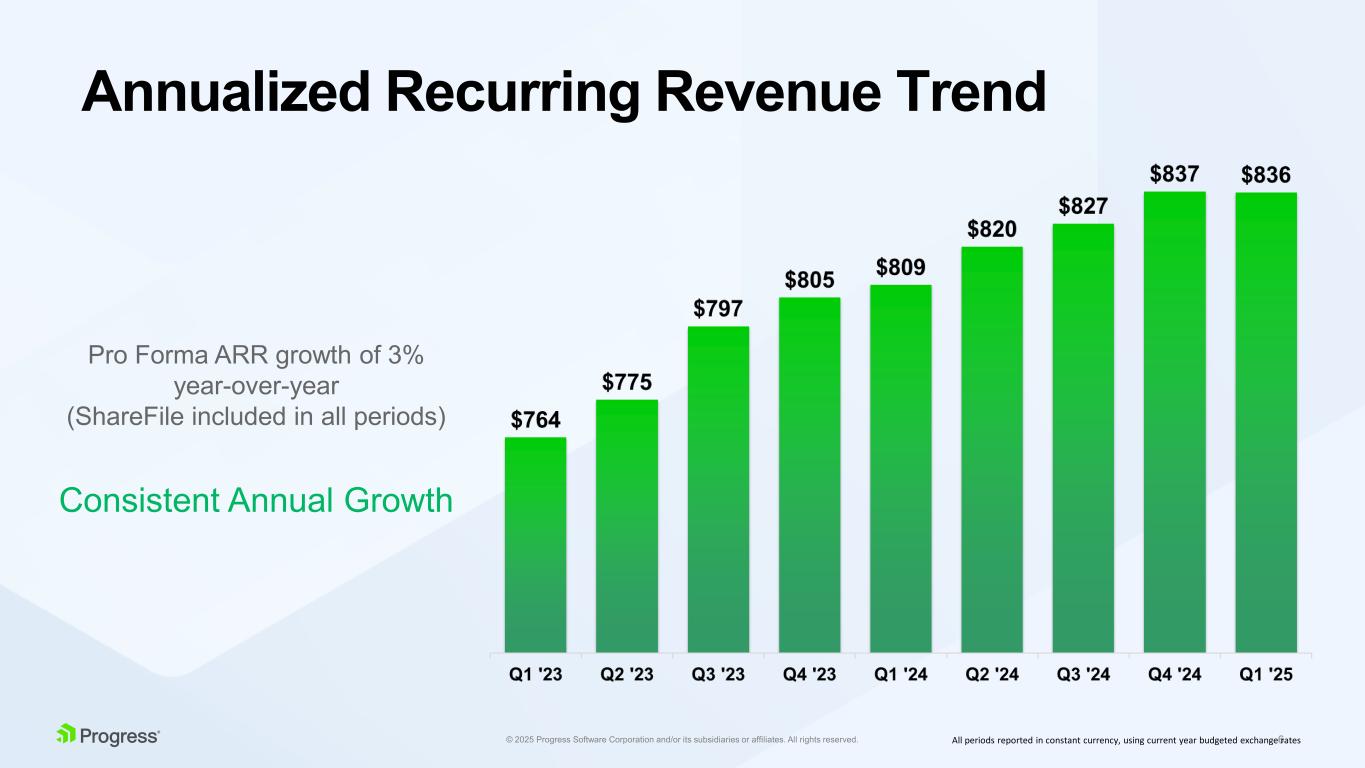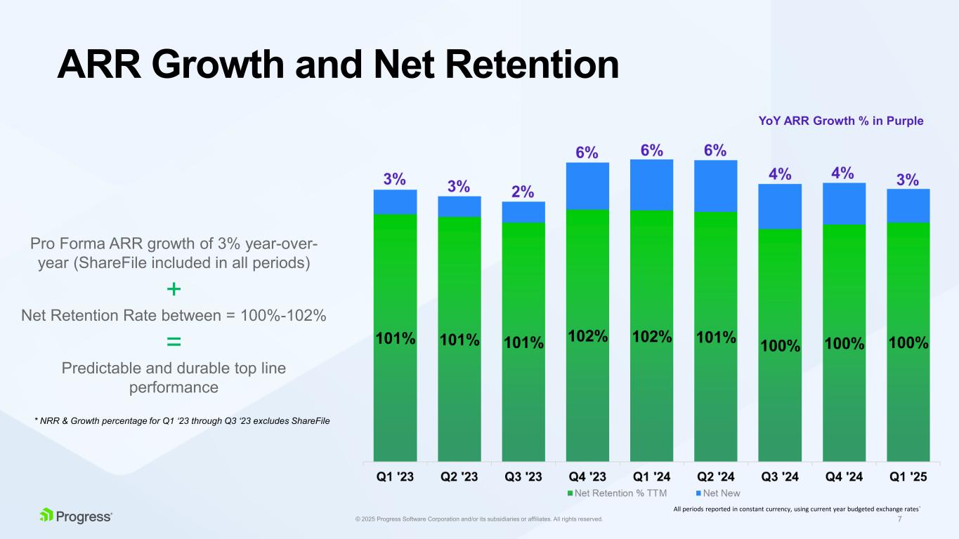 6© 2025 Progress Software Corporation and/or its subsidiaries or affiliates. All rights reserved. Annualized Recurring Revenue Trend All periods reported in constant currency, using current year budgeted exchange rates Pro Forma ARR growth of 3% year-over-year (ShareFile included in all periods) Consistent Annual Growth