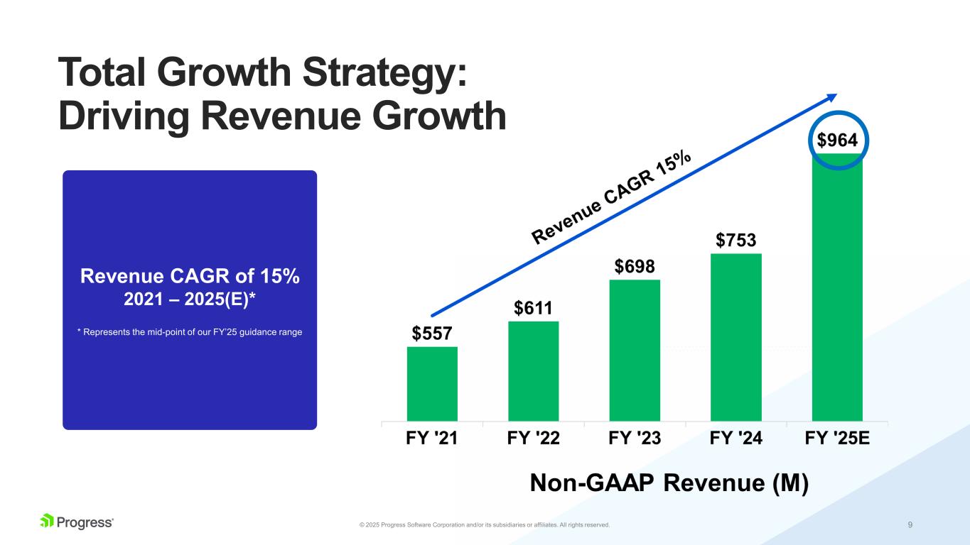 8© 2025 Progress Software Corporation and/or its subsidiaries or affiliates. All rights reserved. Total Growth Strategy: Driving ARR Growth ARR CAGR of 19% Q1 2020 – Q1 2025 All periods reported in constant currency, using current year budgeted exchange rates