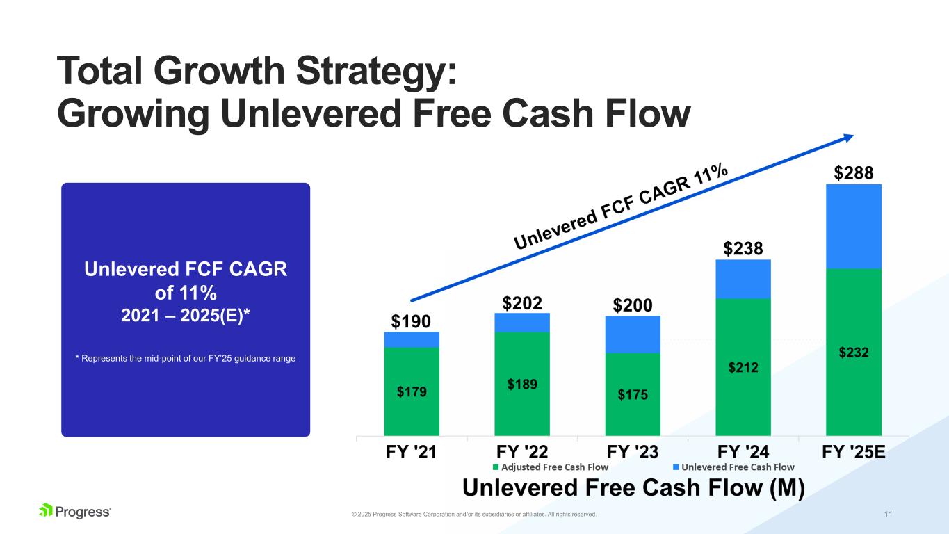 10© 2025 Progress Software Corporation and/or its subsidiaries or affiliates. All rights reserved. Operating Income CAGR of 13% 2021 – 2025(E)* Best-in-class non-GAAP operating margins consistently above 35% * Represents the mid-point of our FY’25 guidance range Total Growth Strategy: Growing Profitability