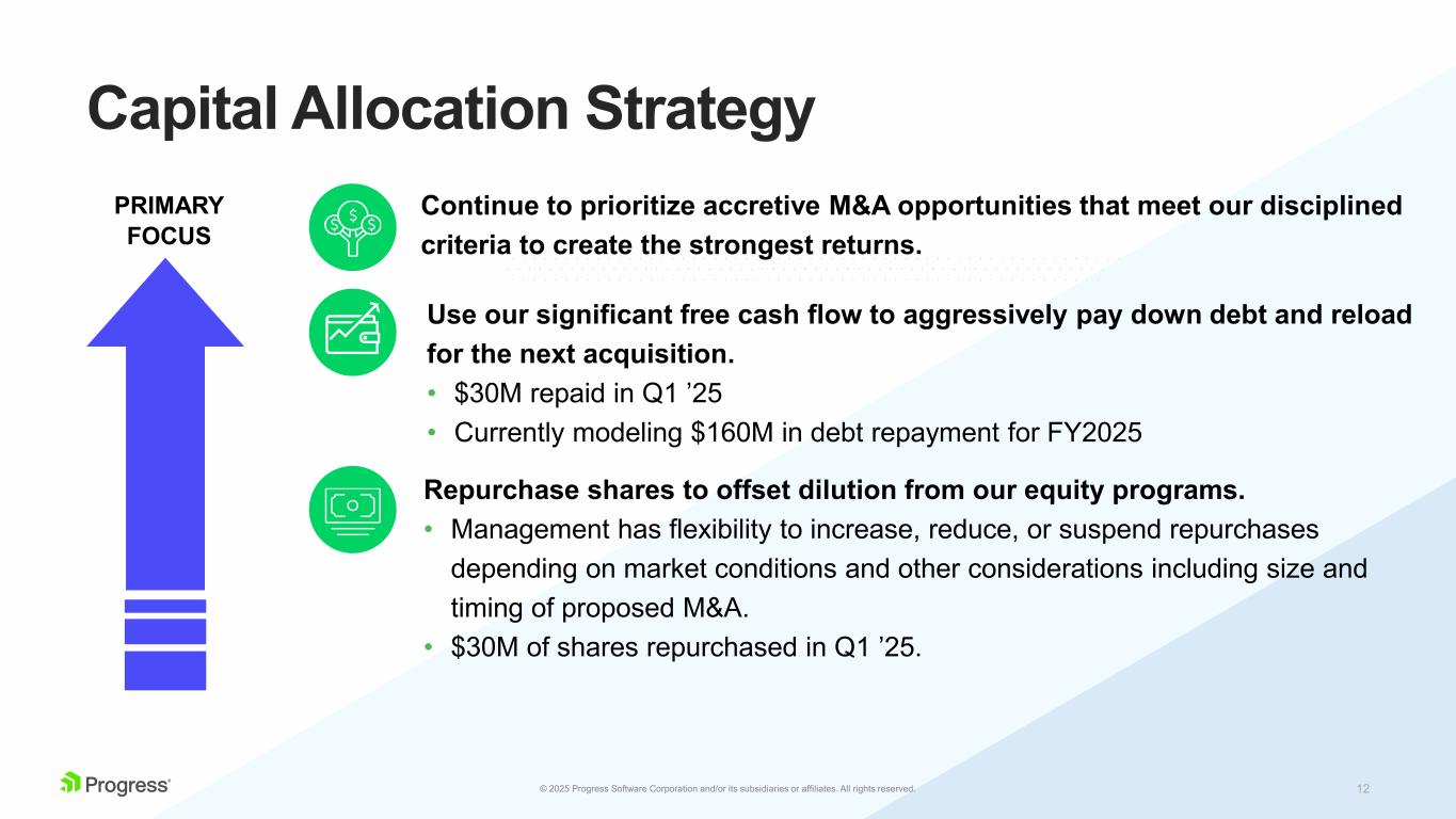 11© 2025 Progress Software Corporation and/or its subsidiaries or affiliates. All rights reserved. Unlevered FCF CAGR of 11% 2021 – 2025(E)* * Represents the mid-point of our FY’25 guidance range Total Growth Strategy: Growing Unlevered Free Cash Flow