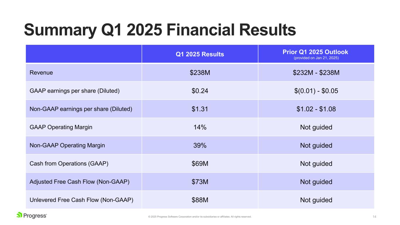 13© 2025 Progress Software Corporation and/or its subsidiaries or affiliates. All rights reserved. Well Defined M&A Framework Cast a wide net across infrastructure software and all aspects of the development lifecycle Tight alignment increases synergy potential ~10-25% of current Progress revenues Can be financed and integrated efficiently High recurring revenue and customer retention Potential to achieve operational efficiency Focused on sustained returns, accretiveROIC > WACC Financial Characteristics Appropriate Sizing End Market Alignment