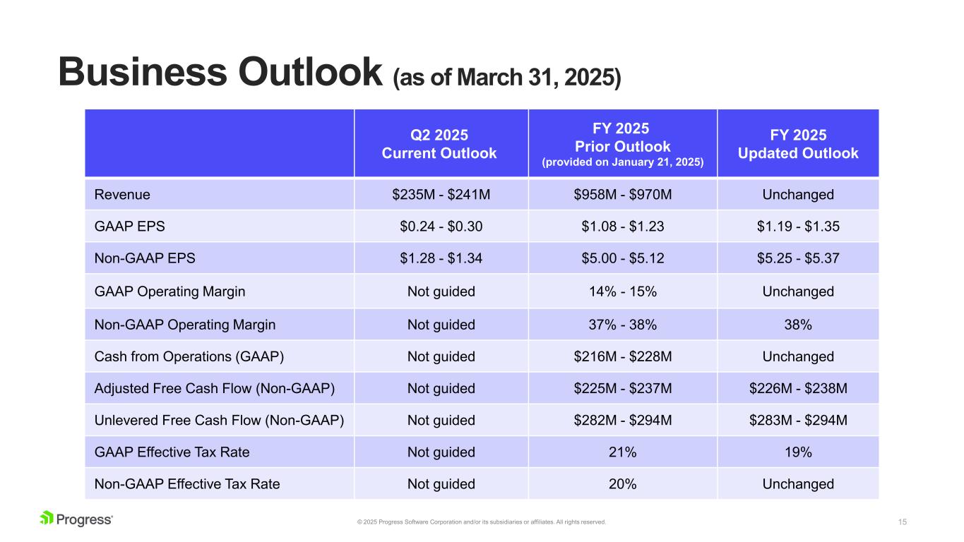 14© 2025 Progress Software Corporation and/or its subsidiaries or affiliates. All rights reserved. Summary Q1 2025 Financial Results Q1 2025 Results Prior Q1 2025 Outlook (provided on Jan 21, 2025) Revenue $238M $232M - $238M GAAP earnings per share (Diluted) $0.24 $(0.01) - $0.05 Non-GAAP earnings per share (Diluted) $1.31 $1.02 - $1.08 GAAP Operating Margin 14% Not guided Non-GAAP Operating Margin 39% Not guided Cash from Operations (GAAP) $69M Not guided Adjusted Free Cash Flow (Non-GAAP) $73M Not guided Unlevered Free Cash Flow (Non-GAAP) $88M Not guided
