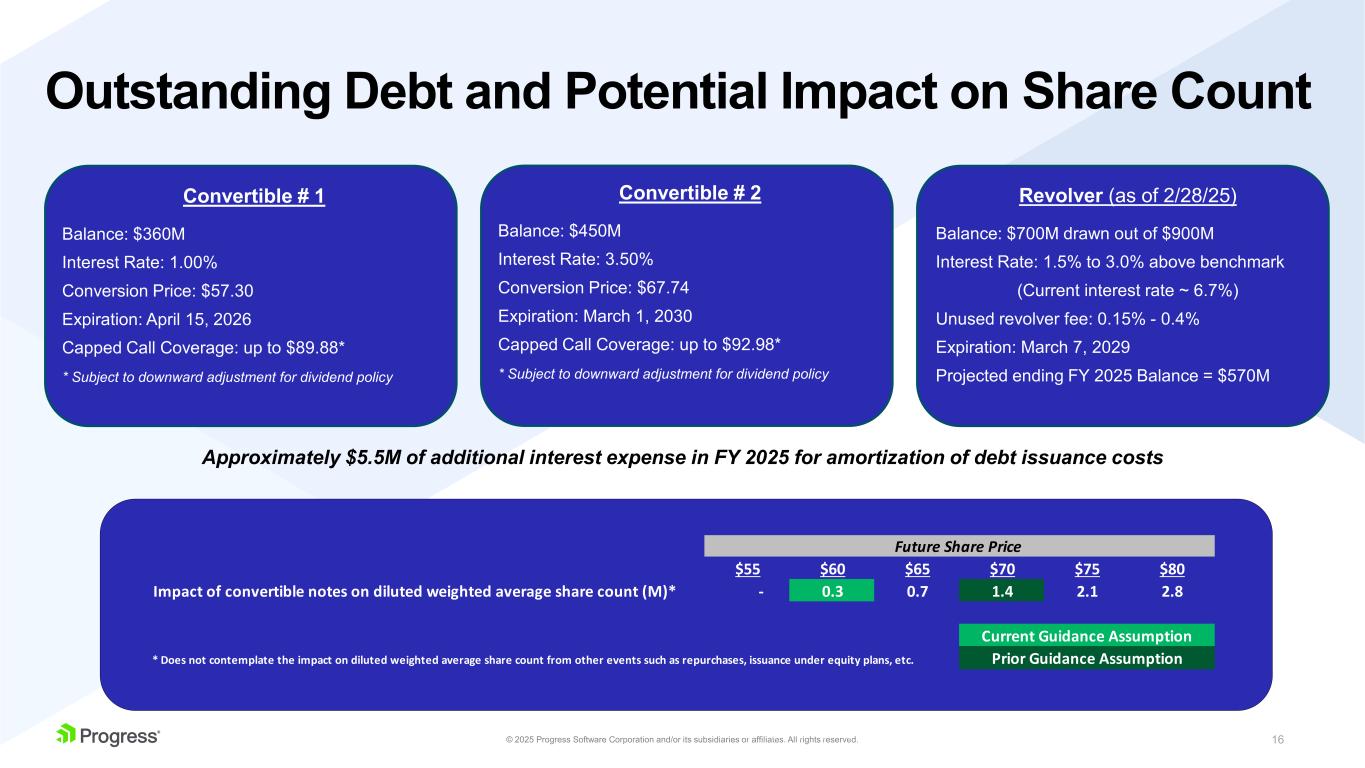 15© 2025 Progress Software Corporation and/or its subsidiaries or affiliates. All rights reserved. Business Outlook (as of March 31, 2025) Q2 2025 Current Outlook FY 2025 Prior Outlook (provided on January 21, 2025) FY 2025 Updated Outlook Revenue $235M - $241M $958M - $970M Unchanged GAAP EPS $0.24 - $0.30 $1.08 - $1.23 $1.19 - $1.35 Non-GAAP EPS $1.28 - $1.34 $5.00 - $5.12 $5.25 - $5.37 GAAP Operating Margin Not guided 14% - 15% Unchanged Non-GAAP Operating Margin Not guided 37% - 38% 38% Cash from Operations (GAAP) Not guided $216M - $228M Unchanged Adjusted Free Cash Flow (Non-GAAP) Not guided $225M - $237M $226M - $238M Unlevered Free Cash Flow (Non-GAAP) Not guided $282M - $294M $283M - $294M GAAP Effective Tax Rate Not guided 21% 19% Non-GAAP Effective Tax Rate Not guided 20% Unchanged