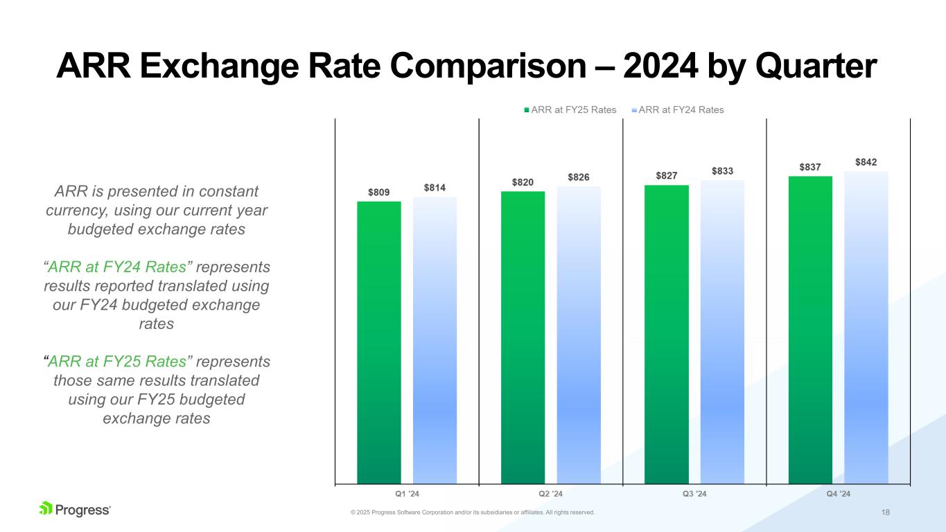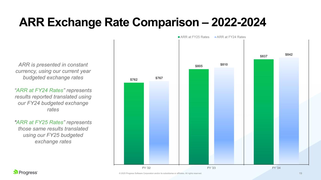 18© 2025 Progress Software Corporation and/or its subsidiaries or affiliates. All rights reserved. ARR Exchange Rate Comparison – 2024 by Quarter ARR is presented in constant currency, using our current year budgeted exchange rates “ARR at FY24 Rates” represents results reported translated using our FY24 budgeted exchange rates “ARR at FY25 Rates” represents those same results translated using our FY25 budgeted exchange rates