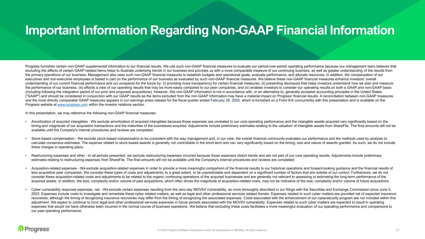 21© 2025 Progress Software Corporation and/or its subsidiaries or affiliates. All rights reserved. Progress furnishes certain non-GAAP supplemental information to our financial results. We use such non-GAAP financial measures to evaluate our period-over-period operating performance because our management team believes that excluding the effects of certain GAAP-related items helps to illustrate underlying trends in our business and provides us with a more comparable measure of our continuing business, as well as greater understanding of the results from the primary operations of our business. Management also uses such non-GAAP financial measures to establish budgets and operational goals, evaluate performance, and allocate resources. In addition, the compensation of our executives and non-executive employees is based in part on the performance of our business as evaluated by such non-GAAP financial measures. We believe these non-GAAP financial measures enhance investors’ overall understanding of our current financial performance and our prospects for the future by: (i) providing more transparency for certain financial measures, (ii) presenting disclosure that helps investors understand how we plan and measure the performance of our business, (iii) affords a view of our operating results that may be more easily compared to our peer companies, and (iv) enables investors to consider our operating results on both a GAAP and non-GAAP basis (including following the integration period of our prior and proposed acquisitions). However, this non-GAAP information is not in accordance with, or an alternative to, generally accepted accounting principles in the United States ("GAAP") and should be considered in conjunction with our GAAP results as the items excluded from the non-GAAP information may have a material impact on Progress’ financial results. A reconciliation between non-GAAP measures and the most directly comparable GAAP measures appears in our earnings press release for the fiscal quarter ended February 28, 2025, which is furnished on a Form 8-K concurrently with this presentation and is available on the Progress website at www.progress.com within the investor relations section. In this presentation, we may reference the following non-GAAP financial measures: • Amortization of acquired intangibles - We exclude amortization of acquired intangibles because those expenses are unrelated to our core operating performance and the intangible assets acquired vary significantly based on the timing and magnitude of our acquisition transactions and the maturities of the businesses acquired. Adjustments include preliminary estimates relating to the valuation of intangible assets from ShareFile. The final amounts will not be available until the Company's internal procedures and reviews are completed. • Stock-based compensation - We exclude stock-based compensation to be consistent with the way management and, in our view, the overall financial community evaluates our performance and the methods used by analysts to calculate consensus estimates. The expense related to stock-based awards is generally not controllable in the short-term and can vary significantly based on the timing, size and nature of awards granted. As such, we do not include these charges in operating plans. • Restructuring expenses and other - In all periods presented, we exclude restructuring expenses incurred because those expenses distort trends and are not part of our core operating results. Adjustments include preliminary estimates relating to restructuring expenses from ShareFile. The final amounts will not be available until the Company's internal procedures and reviews are completed. • Acquisition-related expenses - We exclude acquisition-related expenses in order to provide a more meaningful comparison of the financial results to our historical operations and forward-looking guidance and the financial results of less acquisitive peer companies. We consider these types of costs and adjustments, to a great extent, to be unpredictable and dependent on a significant number of factors that are outside of our control. Furthermore, we do not consider these acquisition-related costs and adjustments to be related to the organic continuing operations of the acquired businesses and are generally not relevant to assessing or estimating the long-term performance of the acquired assets. In addition, the size, complexity and/or volume of past acquisitions, which often drives the magnitude of acquisition-related costs, may not be indicative of the size, complexity and/or volume of future acquisitions. • Cyber vulnerability response expenses, net - We exclude certain expenses resulting from the zero-day MOVEit Vulnerability, as more thoroughly described in our filings with the Securities and Exchange Commission since June 5, 2023. Expenses include costs to investigate and remediate these cyber related matters, as well as legal and other professional services related thereto. Expenses related to such cyber matters are provided net of expected insurance recoveries, although the timing of recognizing insurance recoveries may differ from the timing of recognizing the associated expenses. Costs associated with the enhancement of our cybersecurity program are not included within this adjustment. We expect to continue to incur legal and other professional services expenses in future periods associated with the MOVEit vulnerability. Expenses related to such cyber matters are expected to result in operating expenses that would not have otherwise been incurred in the normal course of business operations. We believe that excluding these costs facilitates a more meaningful evaluation of our operating performance and comparisons to our past operating performance. Important Information Regarding Non-GAAP Financial Information