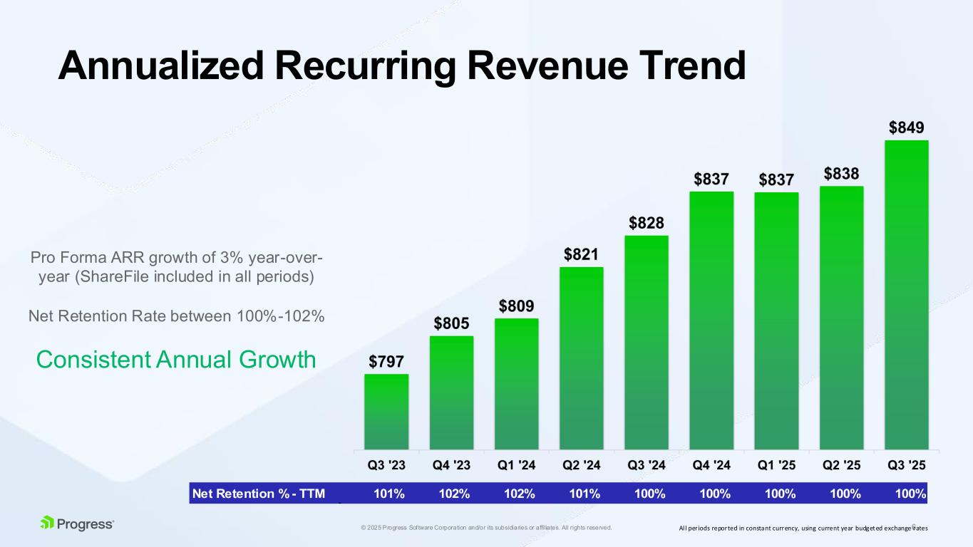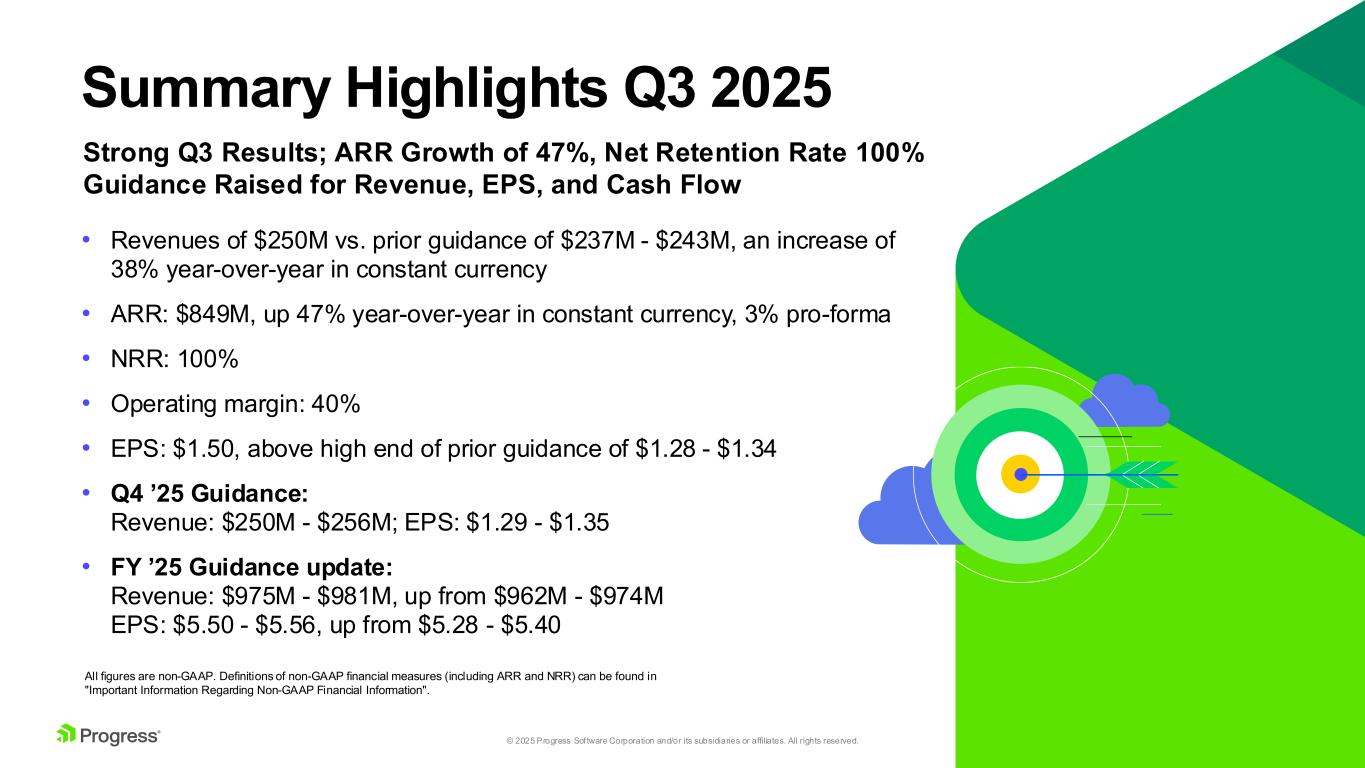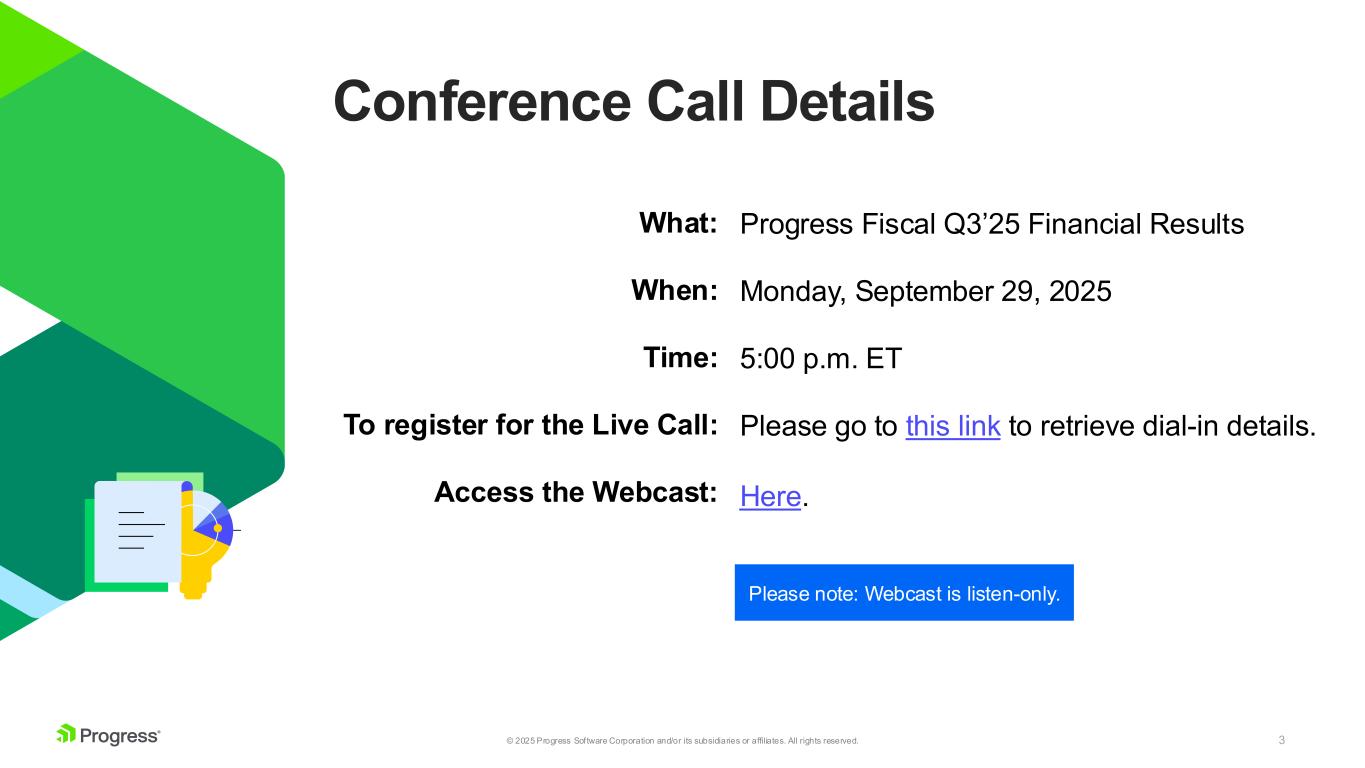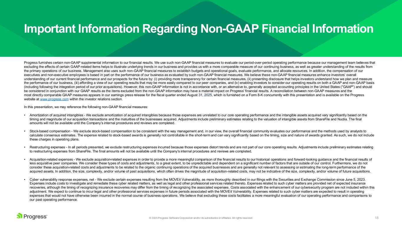 2© 2025 Progress Software Corporation and/or its subsidiaries or affiliates. All rights reserved. Forward Looking Statements This presentation contains statements that are “forward-looking statements” within the meaning of Section 27A of the Securities Act of 1933, as amended, and Section 21E of the Securities Exchange Act of 1934, as amended. Progress has identified some of these forward-looking statements with words like “believe,” “may,” “could,” “would,” “might,” “should,” “expect,” “intend,” “plan,” “target,” “anticipate” and “continue,” the negative of these words, other terms of similar meaning or the use of future dates. Forward-looking statements in this presentation include, but are not limited to, statements regarding Progress’s strategy; future revenue growth, operating margin and cost savings; future acquisitions; and other statements regarding the future operation, direction, prospects and success of Progress’s business. There are a number of factors that could cause actual results or future performance or achievements to differ materially from those anticipated by the forward-looking statements, including, without limitation: (i) economic, geopolitical and market conditions can adversely affect our business, results of operations and financial condition, including our revenue growth and profitability, which in turn could adversely affect our stock price; (ii) our international sales and operations subject us to additional risks that can adversely affect our operating results, including risks relating to foreign currency gains and losses; (iii) we may fail to achieve our financial forecasts due to such factors as delays or size reductions in transactions, fewer large transactions in a particular quarter, fluctuations in currency exchange rates, or a decline in our renewal rates for contracts; (iv) if the security measures for our software, services, other offerings or our internal information technology infrastructure are compromised or subject to a successful cyber-attack, or if our software offerings contain significant coding or configuration errors or zero-day vulnerabilities, we may experience reputational harm, legal claims and financial exposure; and the results of inquiries, investigations and legal claims regarding the MOVEit Vulnerability remain uncertain, while the ultimate resolution of these matters could result in losses that may be material to our financial results for a particular period; (v) future acquisitions may not be successful or may involve unanticipated costs or other integration issues that could disrupt our existing operations; and (vi) expected synergies and benefits of the ShareFIle acquisition may not be realized which could negatively impact our future results of operations and financial condition. For further information regarding risks and uncertainties associated with Progress' business, please refer to Progress' filings with the U.S. Securities and Exchange Commission, including its Annual Report on Form 10-K for the fiscal year ended November 30, 2024, and its Quarterly Report on Form 10-Q for the fiscal quarter ended August 31, 2025. Progress undertakes no obligation to update any forward-looking statements, which speak only as of the date of this presentation. Non-GAAP Financial Measures We refer to certain non-GAAP financial measures in this presentation, including but not limited to, non-GAAP revenue, non-GAAP income from operations and operating margin, adjusted free cash flow, annualized recurring revenue ("ARR"), Net Retention Rate ("NRR"), and non-GAAP diluted earnings per share. These non-GAAP measures are not prepared in accordance with generally accepted accounting principles (“GAAP”). Please see "Important Information Regarding Non-GAAP Financial Information" below for additional information. A reconciliation between non-GAAP measures and the most directly comparable GAAP measures appears in our earnings press release for the fiscal quarter ended August 31, 2025, which is furnished on a Form 8-K concurrently with this presentation and is available in the Investor Relations section of our website.