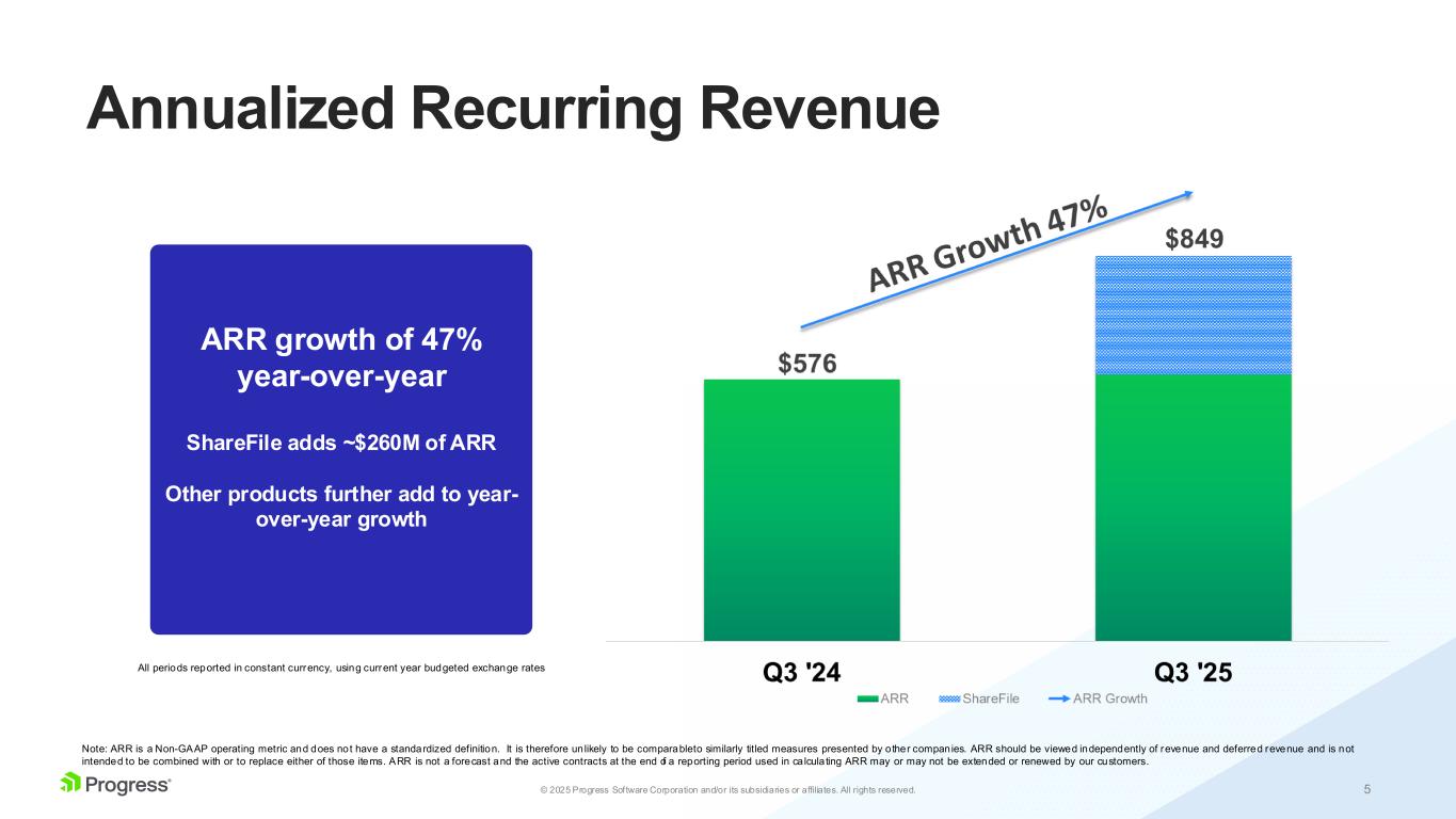 4© 2025 Progress Software Corporation and/or its subsidiaries or affiliates. All rights reserved. Summary Highlights Q3 2025 • Revenues of $250M vs. prior guidance of $237M - $243M, an increase of 38% year-over-year in constant currency • ARR: $849M, up 47% year-over-year in constant currency, 3% pro-forma • NRR: 100% • Operating margin: 40% • EPS: $1.50, above high end of prior guidance of $1.28 - $1.34 • Q4 ’25 Guidance: Revenue: $250M - $256M; EPS: $1.29 - $1.35 • FY ’25 Guidance update: Revenue: $975M - $981M, up from $962M - $974M EPS: $5.50 - $5.56, up from $5.28 - $5.40 All figures are non-GAAP. Definitions of non-GAAP financial measures (including ARR and NRR) can be found in "Important Information Regarding Non-GAAP Financial Information". Strong Q3 Results; ARR Growth of 47%, Net Retention Rate 100% Guidance Raised for Revenue, EPS, and Cash Flow