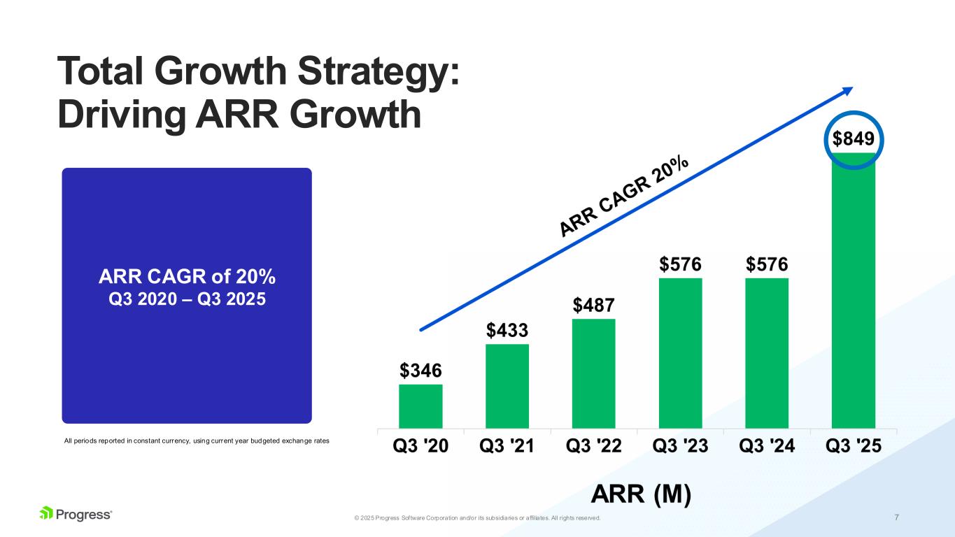 6© 2025 Progress Software Corporation and/or its subsidiaries or affiliates. All rights reserved. Annualized Recurring Revenue Trend Al l periods reported in constant currency, using current year budgeted exchange rates Pro Forma ARR growth of 3% year-over- year (ShareFile included in all periods) Net Retention Rate between 100%-102% Consistent Annual Growth Net Retention % - TTM 101% 102% 102% 101% 100% 100% 100% 100% 100%