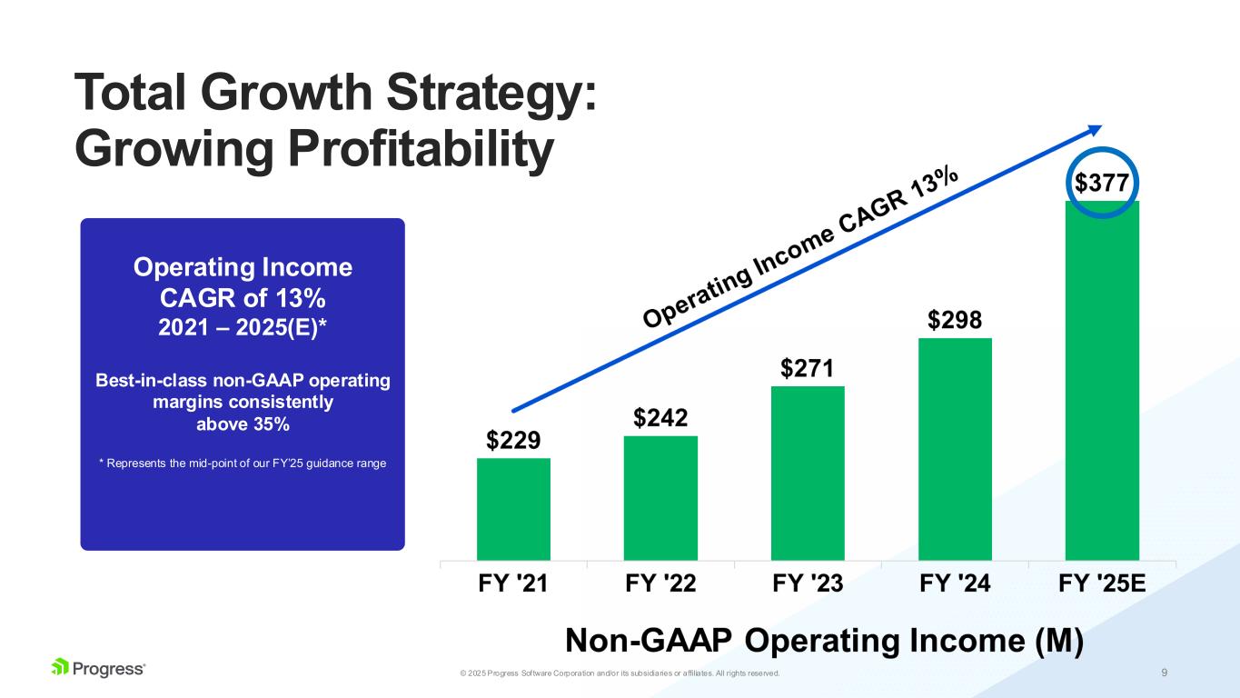 8© 2025 Progress Software Corporation and/or its subsidiaries or affiliates. All rights reserved. Total Growth Strategy: Driving Revenue Growth Revenue CAGR of 15% 2021 – 2025(E)* * Represents the mid-point of our FY’25 guidance range