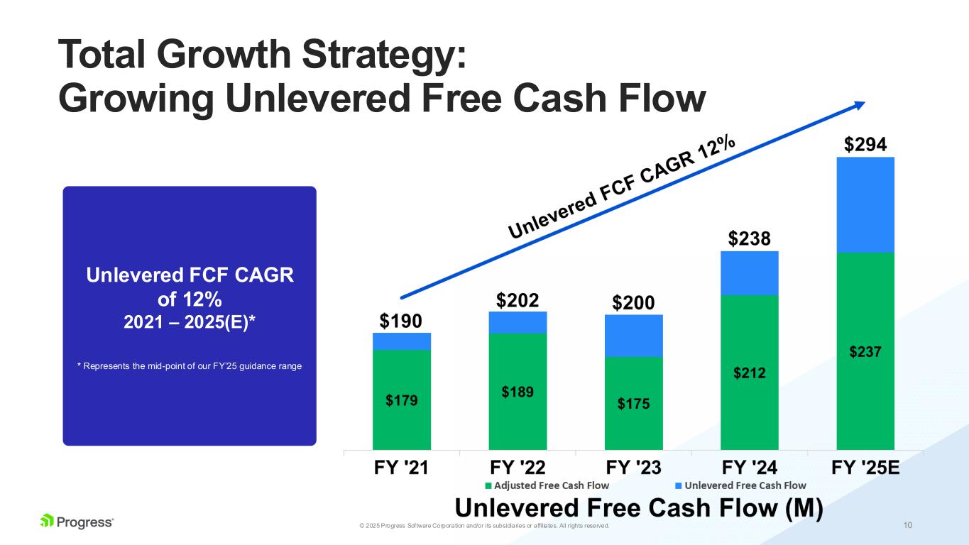 9© 2025 Progress Software Corporation and/or its subsidiaries or affiliates. All rights reserved. Operating Income CAGR of 13% 2021 – 2025(E)* Best-in-class non-GAAP operating margins consistently above 35% * Represents the mid-point of our FY’25 guidance range Total Growth Strategy: Growing Profitability