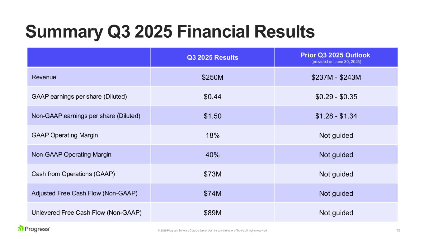 12© 2025 Progress Software Corporation and/or its subsidiaries or affiliates. All rights reserved. Well Defined M&A Framework ▪ Cast a wide net across infrastructure software and all aspects of the development lifecycle ▪ Tight alignment increases synergy potential ▪ ~10-25% of current Progress revenues ▪ Can be financed and integrated efficiently ▪ High recurring revenue and customer retention ▪ Potential to achieve operational efficiency ▪ Focused on sustained returns, accretiveROIC > WACC Financial Characteristics Appropriate Sizing End Market Alignment