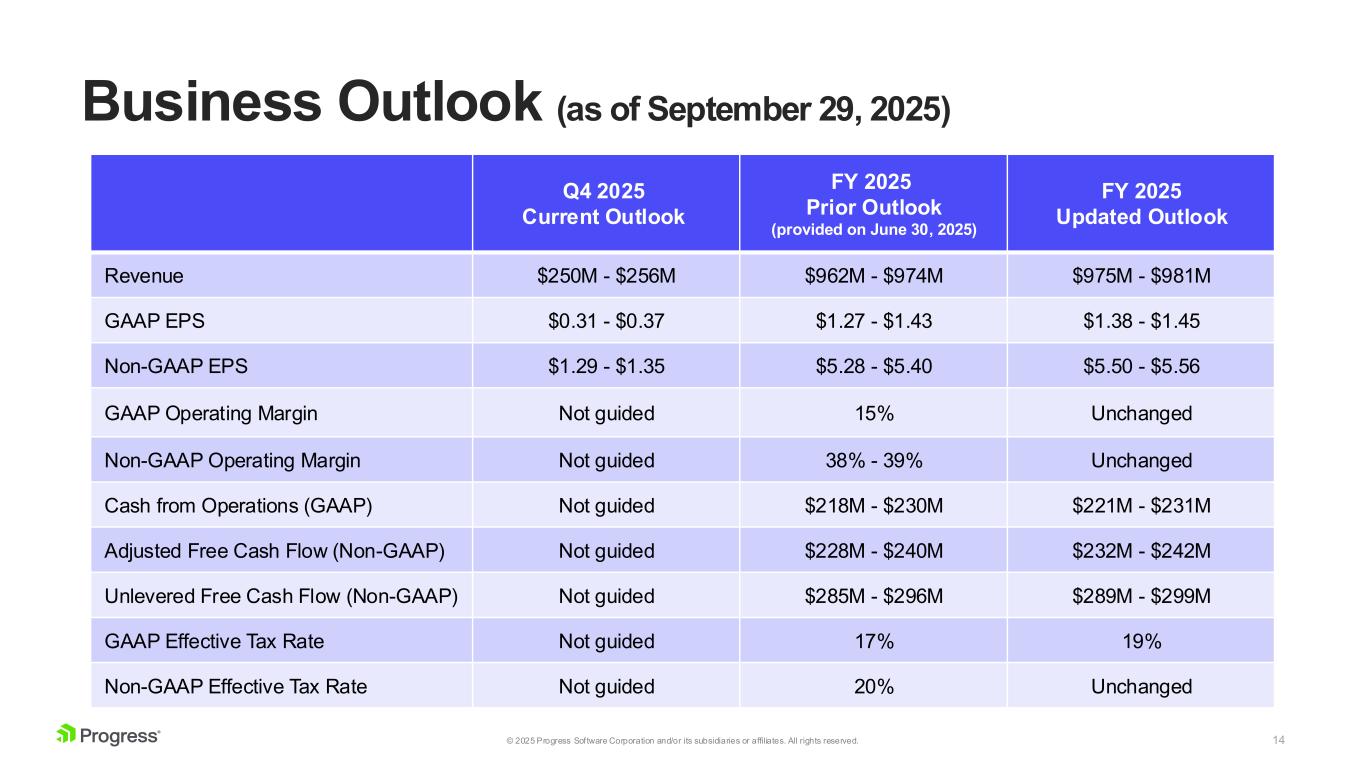 13© 2025 Progress Software Corporation and/or its subsidiaries or affiliates. All rights reserved. Summary Q3 2025 Financial Results Q3 2025 Results Prior Q3 2025 Outlook (provided on June 30, 2025) Revenue $250M $237M - $243M GAAP earnings per share (Diluted) $0.44 $0.29 - $0.35 Non-GAAP earnings per share (Diluted) $1.50 $1.28 - $1.34 GAAP Operating Margin 18% Not guided Non-GAAP Operating Margin 40% Not guided Cash from Operations (GAAP) $73M Not guided Adjusted Free Cash Flow (Non-GAAP) $74M Not guided Unlevered Free Cash Flow (Non-GAAP) $89M Not guided