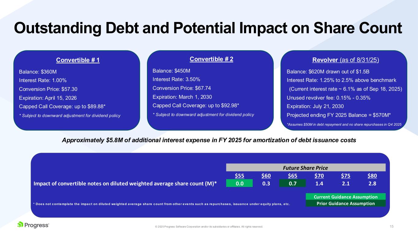 14© 2025 Progress Software Corporation and/or its subsidiaries or affiliates. All rights reserved. Business Outlook (as of September 29, 2025) Q4 2025 Current Outlook FY 2025 Prior Outlook (provided on June 30, 2025) FY 2025 Updated Outlook Revenue $250M - $256M $962M - $974M $975M - $981M GAAP EPS $0.31 - $0.37 $1.27 - $1.43 $1.38 - $1.45 Non-GAAP EPS $1.29 - $1.35 $5.28 - $5.40 $5.50 - $5.56 GAAP Operating Margin Not guided 15% Unchanged Non-GAAP Operating Margin Not guided 38% - 39% Unchanged Cash from Operations (GAAP) Not guided $218M - $230M $221M - $231M Adjusted Free Cash Flow (Non-GAAP) Not guided $228M - $240M $232M - $242M Unlevered Free Cash Flow (Non-GAAP) Not guided $285M - $296M $289M - $299M GAAP Effective Tax Rate Not guided 17% 19% Non-GAAP Effective Tax Rate Not guided 20% Unchanged