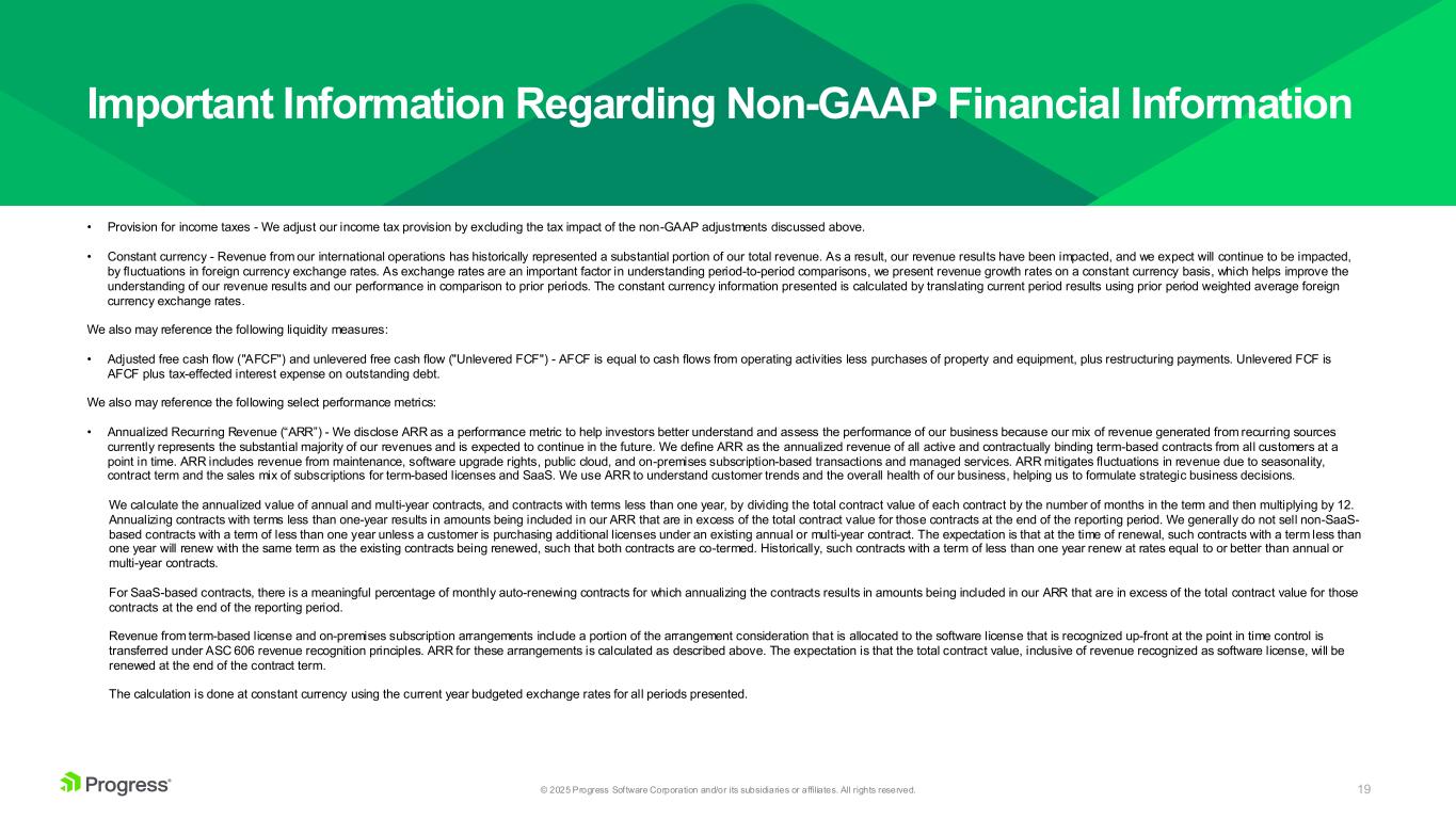 18© 2025 Progress Software Corporation and/or its subsidiaries or affiliates. All rights reserved. Progress furnishes certain non-GAAP supplemental information to our financial results. We use such non-GAAP financial measures to evaluate our period-over-period operating performance because our management team believes that excluding the effects of certain GAAP-related items helps to illustrate underlying trends in our business and provides us with a more comparable measure of our continuing business, as well as greater understanding of the results from the primary operations of our business. Management also uses such non-GAAP financial measures to establish budgets and operational goals, evaluate performance, and allocate resources. In addition, the compensation of our executives and non-executive employees is based in part on the performance of our business as evaluated by such non-GAAP financial measures. We believe these non-GAAP financial measures enhance investors’ overall understanding of our current financial performance and our prospects for the future by: (i) providing more transparency for certain financial measures, (ii) presenting disclosure that helps investors understand how we plan and measure the performance of our business, (iii) affording a view of our operating results that may be more easily compared to our peer companies, and (iv) enabling investors to consider our operating results on both a GAAP and non-GAAP basis (including following the integration period of our prior acquisitions). However, this non-GAAP information is not in accordance with, or an alternative to, generally accepted accounting principles in the United States ("GAAP") and should be considered in conjunction with our GAAP results as the items excluded from the non-GAAP information may have a material impact on Progress’ financial results. A reconciliation between non-GAAP measures and the most directly comparable GAAP measures appears in our earnings press release for the fiscal quarter ended August 31, 2025, which is furnished on a Form 8-K concurrently with this presentation and is available on the Progress website at www.progress.com within the investor relations section. In this presentation, we may reference the following non-GAAP financial measures: • Amortization of acquired intangibles - We exclude amortization of acquired intangibles because those expenses are unrelated to our core operating performance and the intangible assets acquired vary significantly based on the timing and magnitude of our acquisition transactions and the maturities of the businesses acquired. Adjustments include preliminary estimates relating to the valuation of intangible assets from ShareFile and Nuclia. The final amounts will not be available until the Company's internal procedures and reviews are completed. • Stock-based compensation - We exclude stock-based compensation to be consistent with the way management and, in our view, the overall financial community evaluates our performance and the methods used by analysts to calculate consensus estimates. The expense related to stock-based awards is generally not controllable in the short-term and can vary significantly based on the timing, size and nature of awards granted. As such, we do not include these charges in operating plans. • Restructuring expenses - In all periods presented, we exclude restructuring expenses incurred because those expenses distort trends and are not part of our core operating results. Adjustments include preliminary estimates relating to restructuring expenses from ShareFile. The final amounts will not be available until the Company's internal procedures and reviews are completed. • Acquisition-related expenses - We exclude acquisition-related expenses in order to provide a more meaningful comparison of the financial results to our historical operations and forward-looking guidance and the financial results of less acquisitive peer companies. We consider these types of costs and adjustments, to a great extent, to be unpredictable and dependent on a significant number of factors that are outside of our control. Furthermore, we do not consider these acquisition-related costs and adjustments to be related to the organic continuing operations of the acquired businesses and are generally not relevant to assessing or estimating the long-term performance of the acquired assets. In addition, the size, complexity, and/or volume of past acquisitions, which often drives the magnitude of acquisition-related costs, may not be indicative of the size, complexity, and/or volume of future acquisitions. • Cyber vulnerability response expenses, net - We exclude certain expenses resulting from the MOVEit Vulnerability, as more thoroughly described in our filings with the Securities and Exchange Commission since June 5, 2023. Expenses include costs to investigate and remediate these cyber related matters, as well as legal and other professional services related thereto. Expenses related to such cyber matters are provided net of expected insurance recoveries, although the timing of recognizing insurance recoveries may differ from the timing of recognizing the associated expenses. Costs associated with the enhancement of our cybersecurity program are not included within this adjustment. We expect to continue to incur legal and other professional services expenses in future periods associated with the MOVEit Vulnerability. Expenses related to such cyber matters are expected to result in operating expenses that would not have otherwise been incurred in the normal course of business operations. We believe that excluding these costs facilitates a more meaningful evaluation of our operating performance and comparisons to our past operating performance. Important Information Regarding Non-GAAP Financial Information